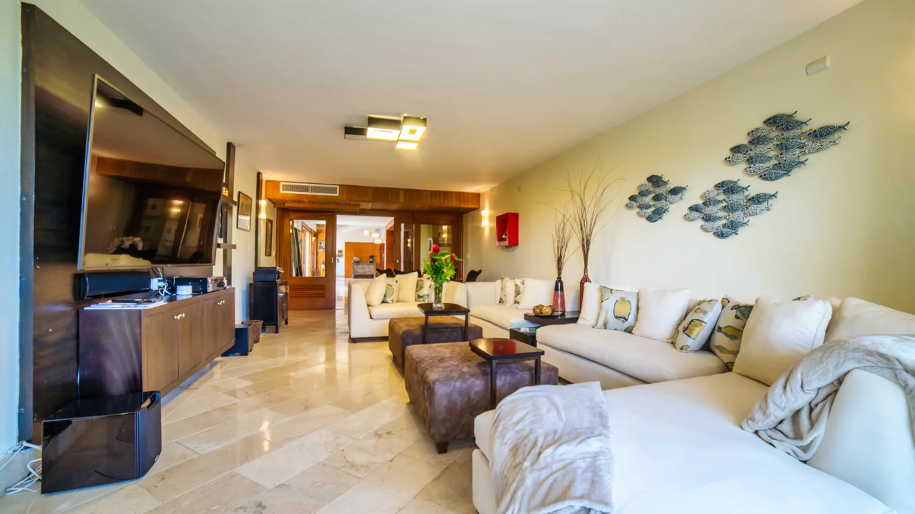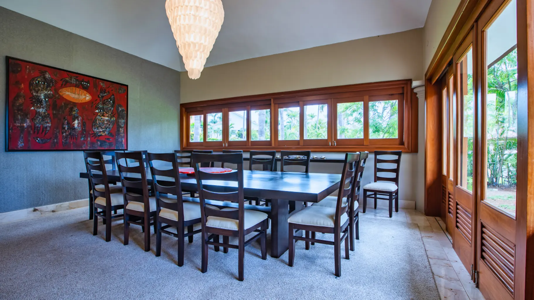 Disfrute de los amplios espacios que incluyen una gran piscina privada y jacuzzi, una elegante sala de estar y espectaculares vistas al mar y al paisaje. La cocina está totalmente equipada y los comedores son versátiles, con mesas para 10 y 6 comensales, además de una mesa redonda en el estudio.